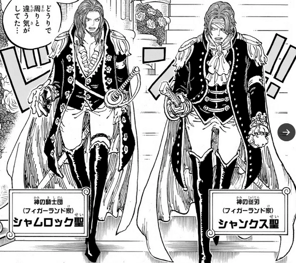 第1086話でシャンクスの正体が明らかになった。五老星がシャンクスを「フィガーランド・シャンクス」と呼んでおり、神の騎士団最高司令官フィガーランド・ガーリング聖の息子であることが示唆されている。つまりシャンクスは天竜人の血を引く人物——世界政府側に属するはずの一族の末裔だ。